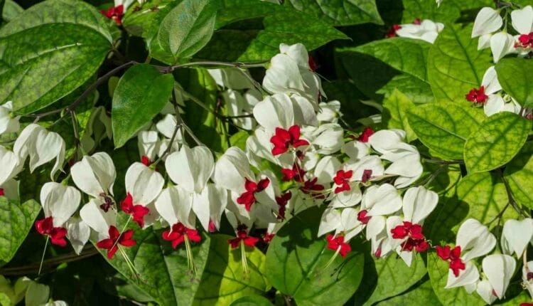 The Bleeding Heart Vine is prized for its unique drooping clusters of white flowers with red centers resembling bleeding hearts. Native to tropical West Africa, this vine is grown for its ornamental value and can be trained to climb or allowed to trail.