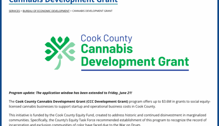 The Cook County Government announced today that the application window for the Cook County Cannabis Development Grant (CCC Development Grant) program has been extended to Friday, June 21. The CCC Development Grant provides up to $3.6 million in grants to businesses that have licenses awarded under the State of Illinois Adult-Use Cannabis Social Equity Program. The program offers grants to social-equity cannabis licensees to defray some of the costs associated with opening and operating a cannabis business in Illinois.