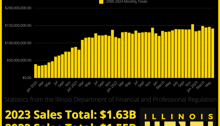 The Illinois Department of Financial and Professional Regulation announced today recreational cannabis sales totals for June 2024. For the fourth-straight month, Illinois’ monthly sales totaled at least $141 million, with June the lowest at $141,752,141.71. In June, dispensaries sold 4,006,004 cannabis items, and in-state resident sales reached $109,136,192.82. Out-of-state resident sales totals reached $32,615,948.89. At this rate, Illinois is projected to surpass by year’s end the 2023 record yearly totals of 1.63 billion.