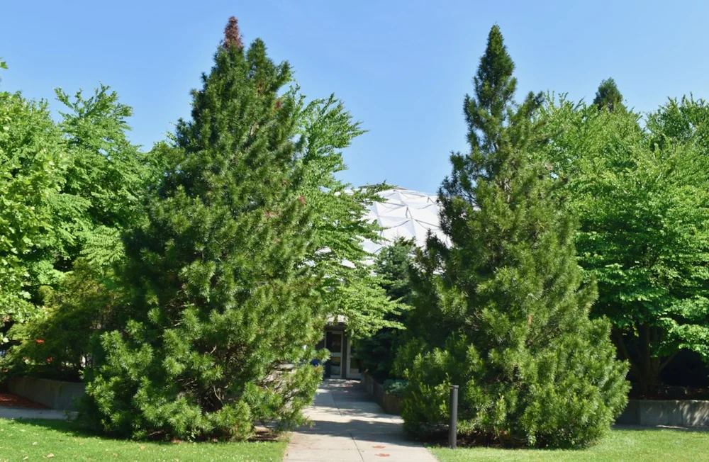 Japanese umbrella pines frame the entrance to the dinosaur state park in rocky hill, Ct.