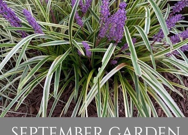 Venturing to the front yard, here is Variegated Lilyturf along the front walkway displaying its vibrant purple blooms. I enjoy this perennial all season long for its foliage alone, but the blooms are just fabulous late summer into fall! Care Tip: To protect Liriope from winter damage, leave the foliage of this perennial over winter and prune it back in early spring as new growth emerges.