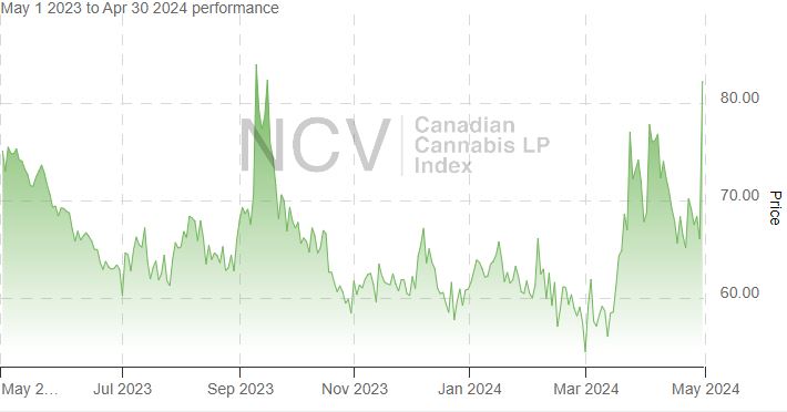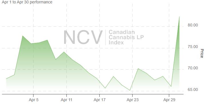 The Canadian Cannabis LP Index exploded higher in April from an all-time low set at the end of March. In April, it gained 14.5% to 82.33: