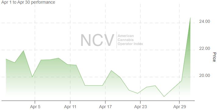 The American Cannabis Operator Index was quite strong in January after declining in December, but it plunged in February and then rallied in March. In April, it rose 17.7% to 24.37 :