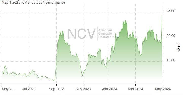 After a massive loss of 76.6% in 2022, it declined 10.9% in 2023 to 13.38, which was better than the Global Cannabis Stock Index. It is up 12.4% in 2024: