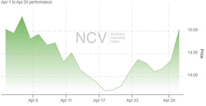 The Ancillary Cannabis Index was very strong in March, but it fell 1.2% in April to 15.04: