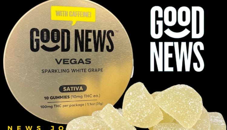 Good News Vegas Sparkling White Grape Gummies come as a 10-pack of gummies with 10mg of THC per piece. The ingredients are sugar, glucose syrup, pectin, sorbitol, potassium citrate, citric acid, natural and artificial flavors, natural caffeine (derived from tea), and cannabis oil.